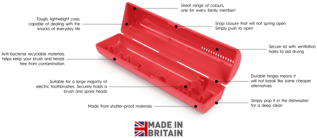 Compatible with the majority of Oral B brushes plus many other brands, the case is compact enough to neatly fit into the bathroom cabinet, a travel suitcase or small overnight bag. The rigid construction will prevent the brush from accidentally being switched on during transport so no more flat batteries when you need it most. With 8 colours to choose from, they’re great for all the family, so everyone’s brush can be kept clean and ready to go at the drop of a hat.
